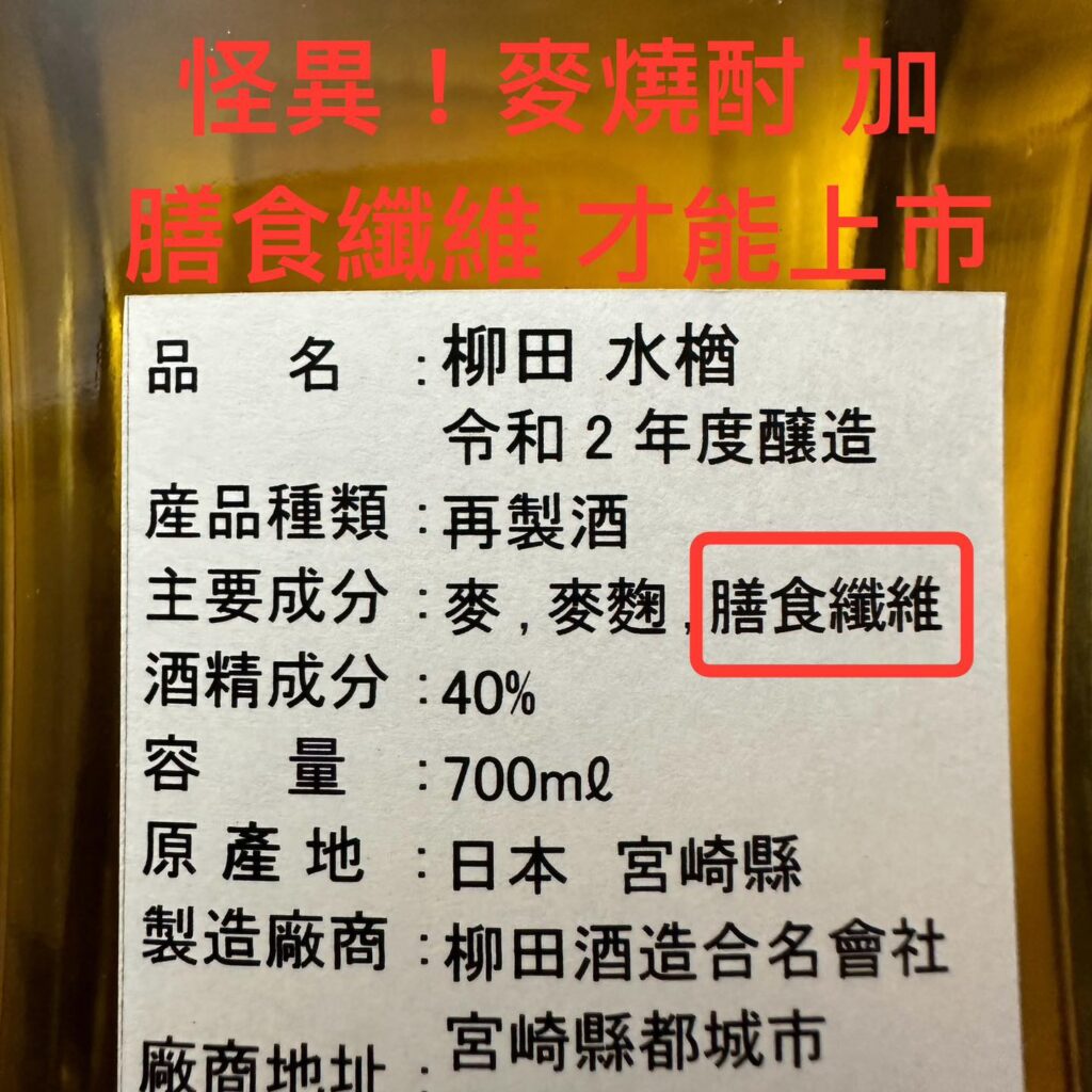 麥燒酎(類日威)為何要加 膳食纖維?不加還不能販售!故事要從酒友介紹的「柳田 水楢桶」開始,買回來後發現居然有這成分,開始做了些研究,原來這跟日本酒稅法有直接關係,是一種「奇妙的廠商與政府法令間的折衷方案」,而且這樣進口台灣說不定還能省很多稅?<文末補充 進口大神寶貴經驗>