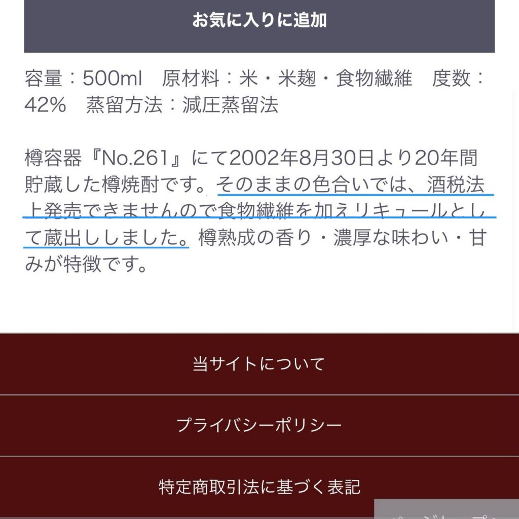 柳田決不是特例,我們也找了福田酒造的樽米燒酎,可以看到他們也是添加膳食纖維,並有提到這是為了符合酒稅法的原因