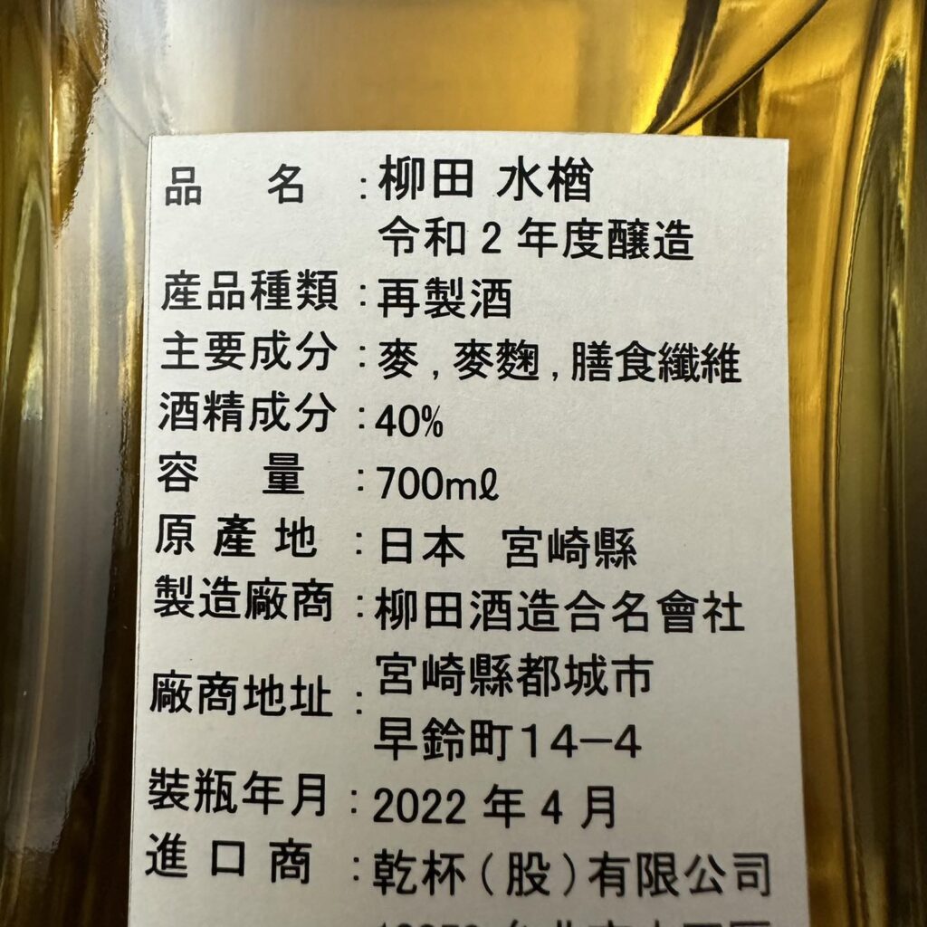 之前有介紹過,日本燒酎有所謂的「光量規制」限制,簡單說就是顏色不能太深,極限推測大概是「吾空」或「黑馬 長期熟成」的金黃色,像「柳田 水樽桶」的顏色已經太深,就不能用「燒酎」名義上架販售