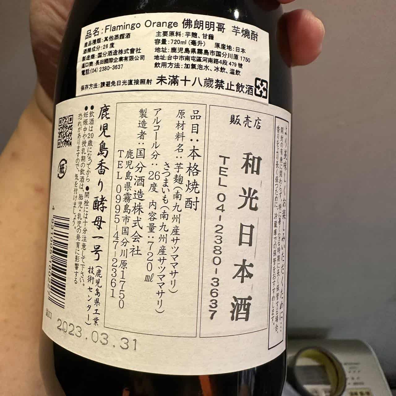 Flamingo Orange也是國分酒造出品,與Coolmint green不同在它使用的是芋麴(全量芋),它的前身「いも麹芋 丸造り」也是採用減壓蒸餾,以50度左右蒸餾酒醪而出的酒液,風格是輕柔易飲但衝擊性(インパクト)不夠,於是酒造改變了酵母的種類,採用鹿兒島工業技術中心研發的鹿兒島香酵母1號(鹿児島香り酵母1号)。