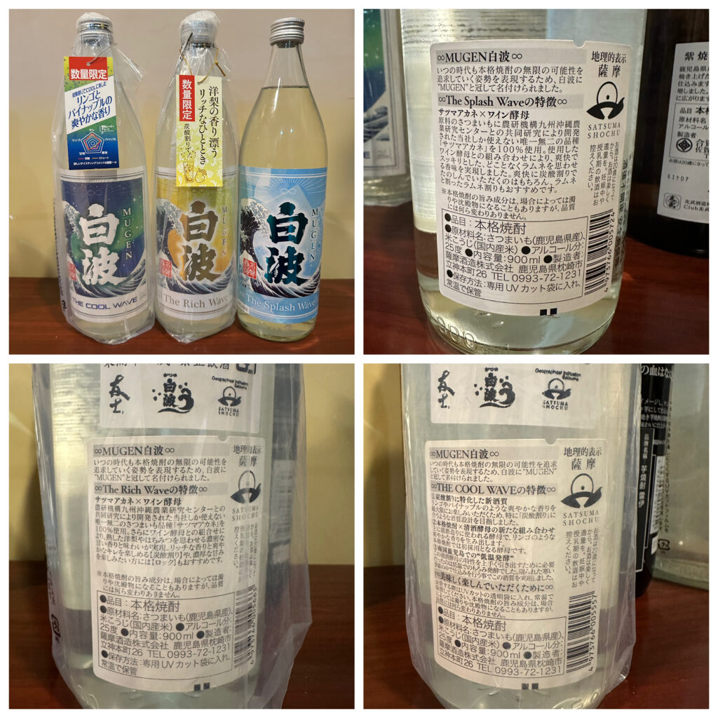 無限白波(MUGEN SHIRANAMI)系列 目前總共發表六款作品,除了第一款名字只用「MUGEN白波」,和第五款前面加上「別撰」外,其他四款都會加上「The xxx Wave」,酒標配色不同,並且都會裝在「透明的UV阻斷膜」內,來減少透明瓶身容易因光線而產生變質的疑慮,保存時請記得一定要套著UV CUT,不要拆掉比較好。(我在 酒條通 買的沒UV CUT,等他們上班時我再問一下,是否只是漏了,還是他們進的這批都沒有,確定日本買是有的,白波官網也有,但不管如何都是避光儲藏最好)