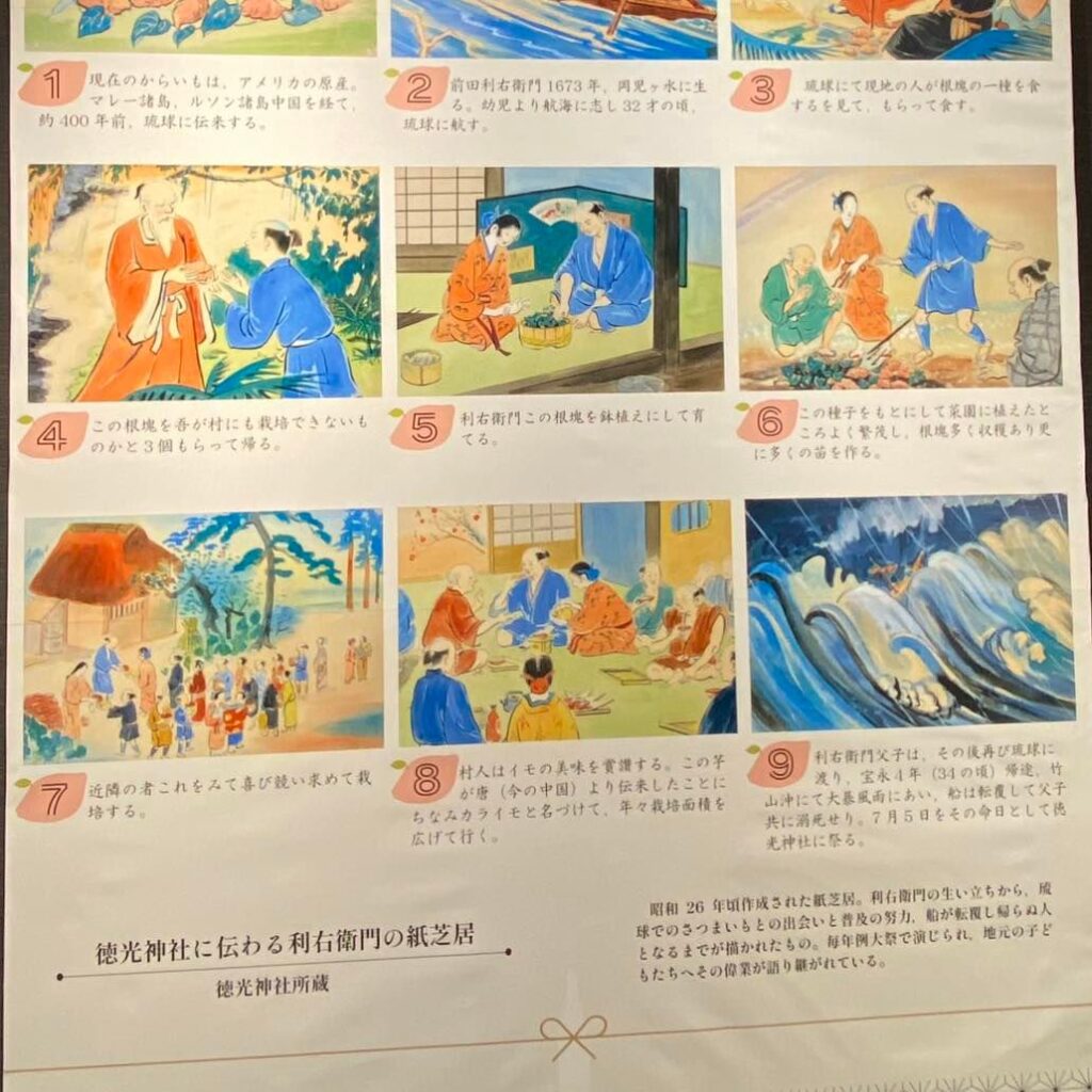 「甘藷翁」是眾人感念「將甘藷引進薩摩的前田利右衛門」的稱號,我們在指宿市考古博物館時遊館COCCO Hashimure 看到了關於芋燒酎的歷史展覽,前田利右衛門生於1673年,住在 岡児ヶ水(現 指宿市)的他有志於航行,行至琉球時看到當地人吃著某種植物的塊莖,於是他拿了一些回去家鄉種殖。