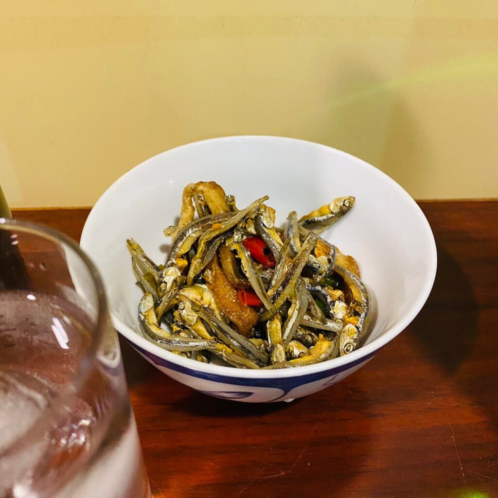 果實香與新鮮地瓜讓我想到之前喝同一家指宿酒造的「赤利右衛門」,不同的地瓜品種與麴,給了我類似的印象。在日本買到他家的「秀水」也有不過度濃郁的風格,冰塊讓酒的香氣更飽滿明亮,還有清冽的感受,配「小魚豆干」也沒有因為鹹味使酒的味道變苦或變淡。