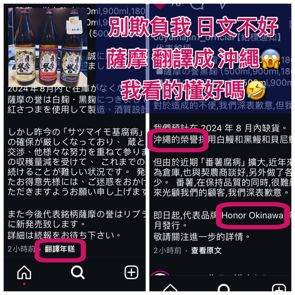 - 我用了幾次ig的「翻譯年糕」發覺有些都蠻好笑的,我覺得很可能是「win 3.1翻的」,雖然我日文不好,但「薩摩 不等於 沖繩」我知道好嗎,下面還硬用英文,別想誤導我🤣