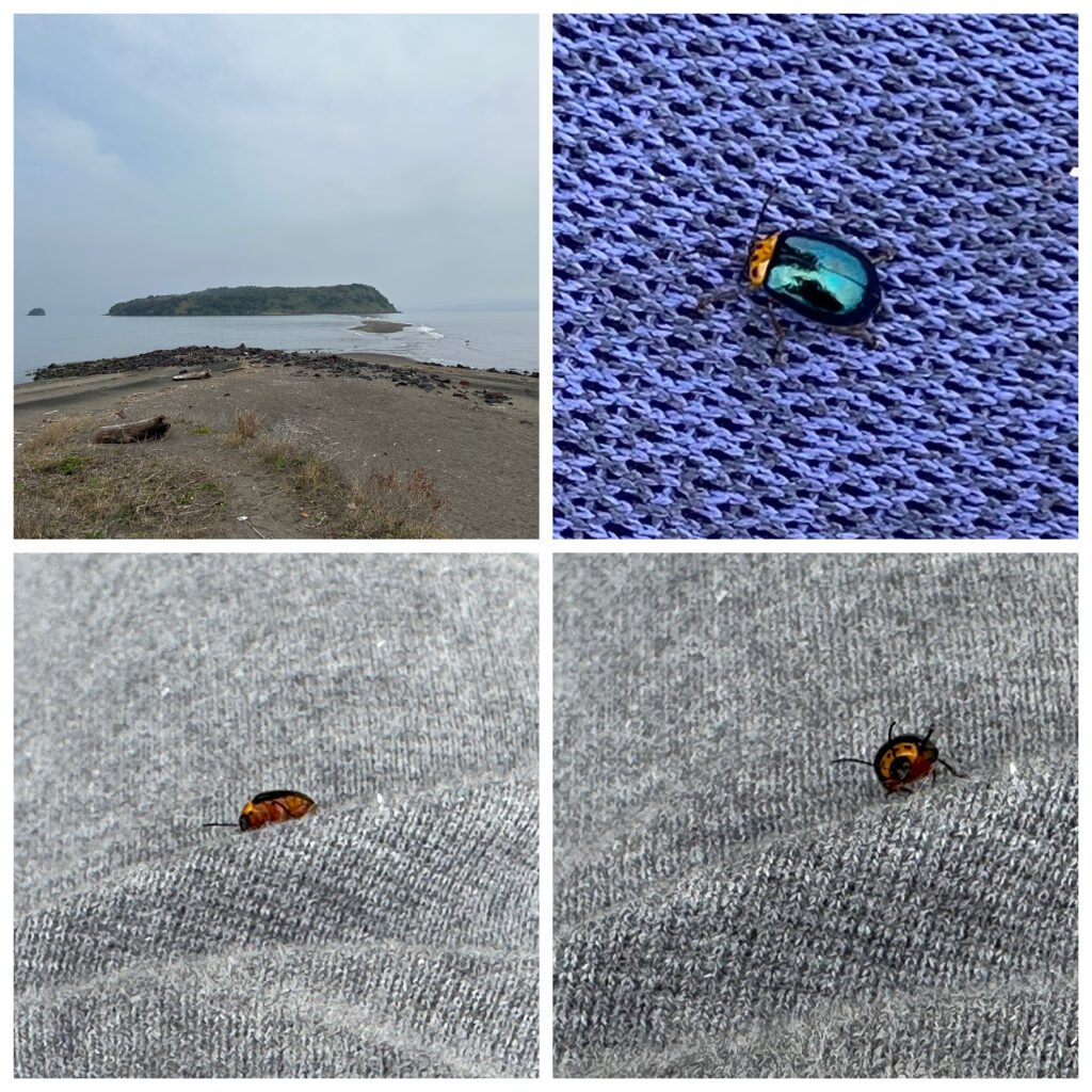- 照片的小島就是「知林ヶ島」,沒漲潮的話可以走過去(還會看到海星擱淺XD),但我們去時已經漲潮了,所以只能走到岸邊拍照,那邊的 金龜子 顏色好晶亮,蠻多的很喜歡爬到人身上,也分享給大看看