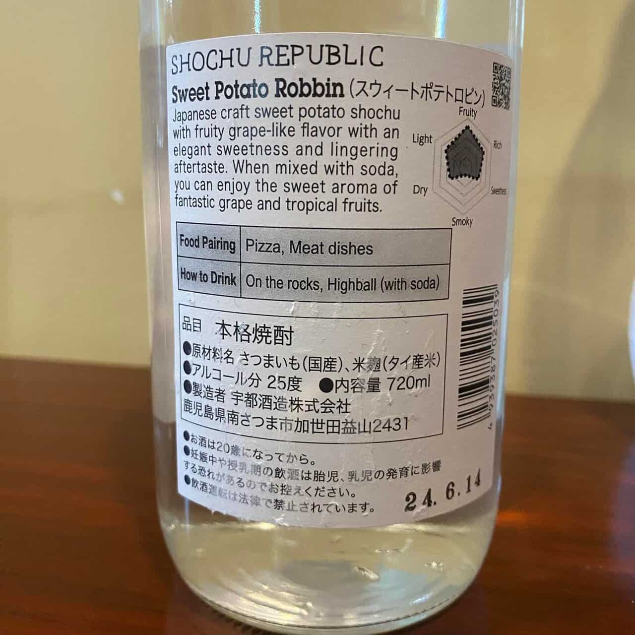 因為 燒酎共和國 的發想是要作為「燒酎的入口」(焼酎の入り口),讓沒喝過的海外酒友都能認識燒酎的特色面貌,這瓶Robbin用高甜度 紅春香 的原料製作,但是喝起來挺清爽,加入冰水的涼爽割り,或者氣泡水的炭酸割り,都是能輕鬆品飲的好選擇,尤其加了氣泡水的Robbin喝下會有酸香的新鮮水果味道,很自然而不是人工增添的甜