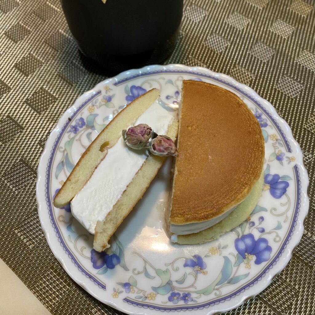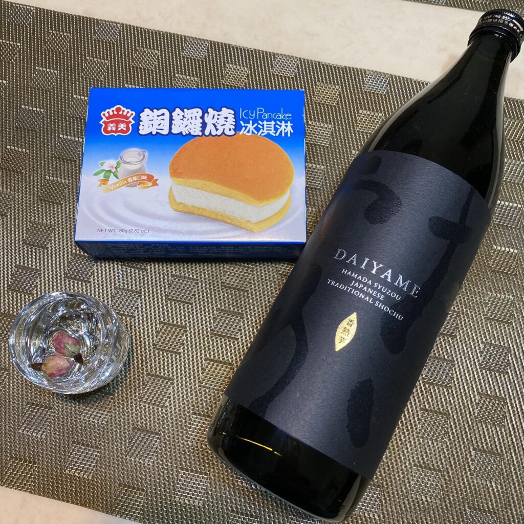 接下來,我把玫瑰DAIYAME淋在切半的 牛奶冰淇淋銅鑼燒 上,使餅皮與內部冰淇淋都能與燒酎直接接觸,變成 玫瑰DAIYAME冰淇淋銅鑼燒 後,鼻子果然聞到荔枝香氣,不過吃在口裡就能辨識絕對的牛奶味存在感;少量的酒味不覺得苦澀,玫瑰花與荔枝的存在變得像是種隱味,雖然不像先前喝燒酎能容易察覺氣味,然而整體味道穩定和諧,也沒有原本單吃冰淇淋的膩口。