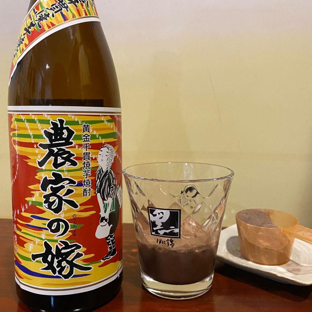 農家之嫁 和 明亮農村 都由同一家酒造 霧島町蒸留所 製作,上次奶茶加入明亮農村,覺得黑白麴調和的樸實性格剛好填補奶茶的不足之處,口感濃醇滑順,也很適合加冰塊飲用,所以這一次選擇健身必備的乳清蛋白加入農家之嫁😁,看看味道會有甚麼特殊轉變