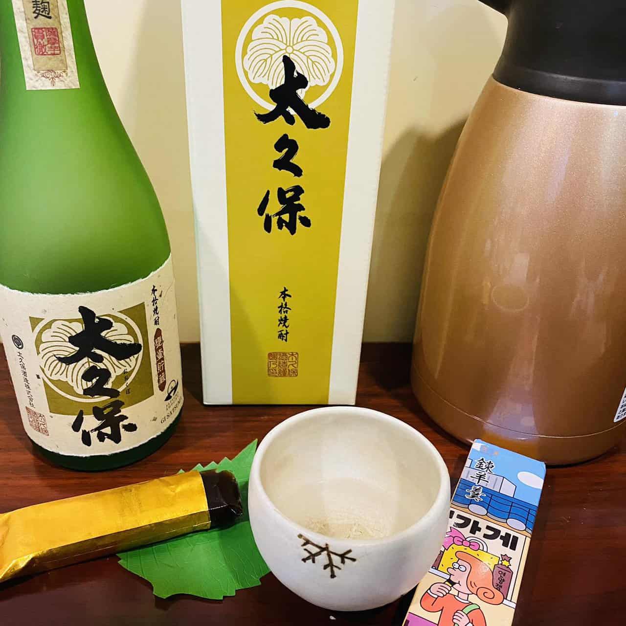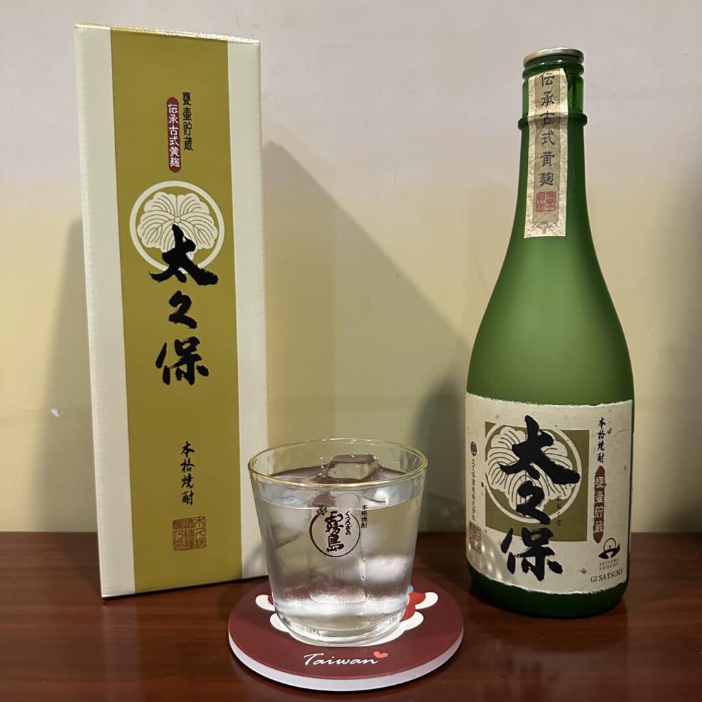 「傳承古式黃麴-太久保酒造」瓶身採用綠色霧面玻璃設計,我很喜歡這樣的設計,既有沉鬱的質感又好看,綠色還能有效阻隔光線🕶️當直接聞這款常溫的燒酎時,會有類似梅花的香氣,味道非常柔和,純飲時十分美味