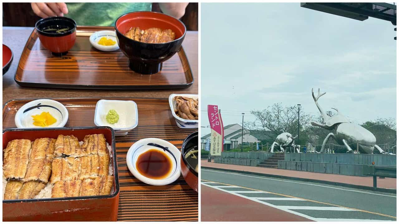 「台灣人在天星酒造見學」從鹿屋經過超好吃的「うなぎ太郎」與「兩隻巨大金屬獨角仙(セントロランド 道の駅)」後,路上看到高高的煙囪就是那聞名遐邇的「天星酒造」了(但見學後幾天,煙囪因為安全因素拆了,還好最後還有看到😄)
