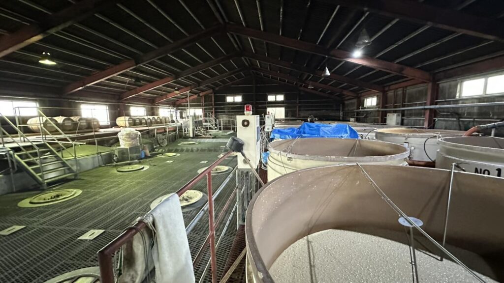 而天星的發酵槽,跟大海酒造 或 一些地板架高式的酒造(明石酒造、霧島酒造),發酵槽露出高度到腳踝再用防護欄的方式不同,跟大口酒造比較類似,發酵槽大概到成人腰部低一點左右,可以很容易看到發酵的狀態