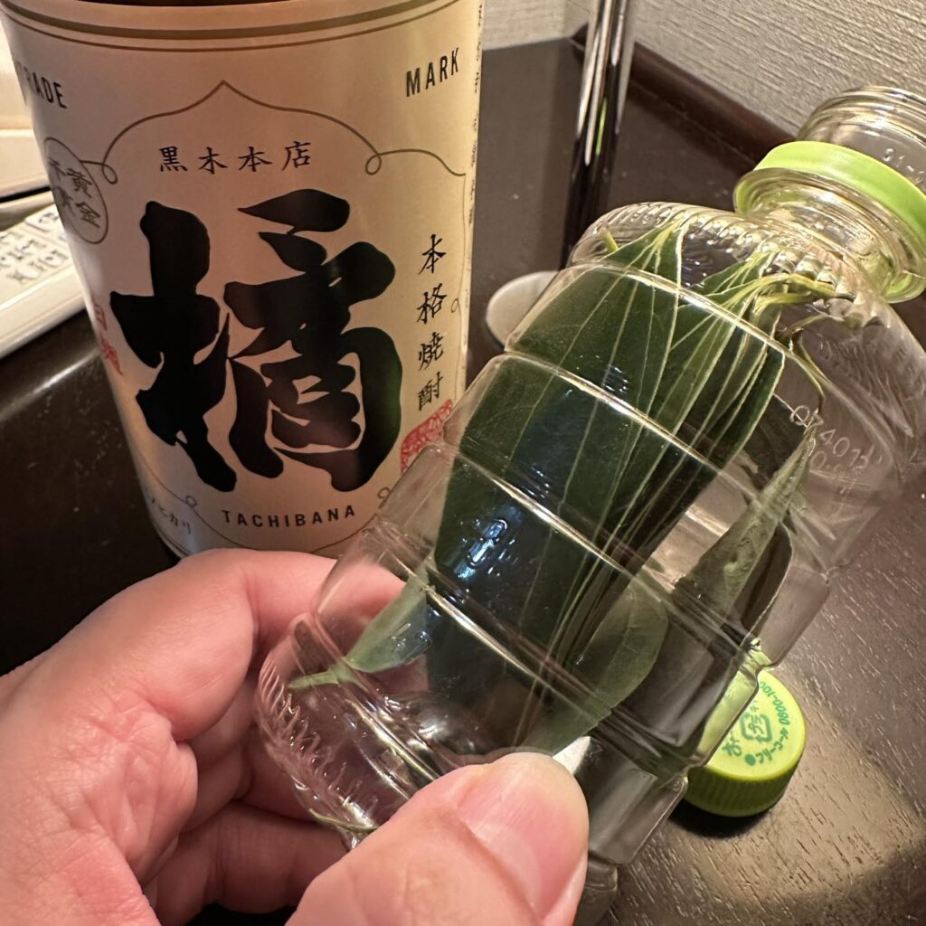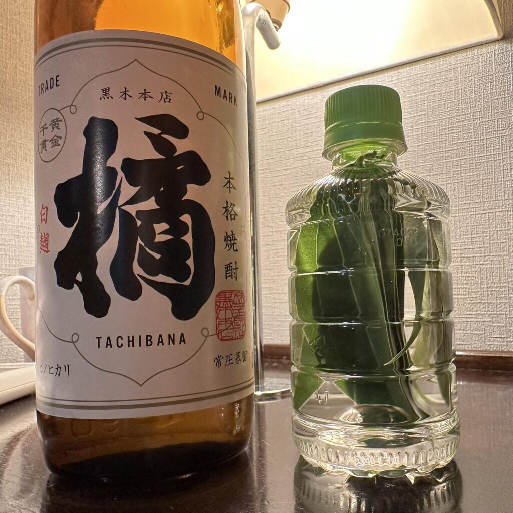 會選她是因為,雖然名稱容易讓人誤以為是「橘芋燒酎」,但其實是「白麴、黃金千貫燒酎」(很好的 燒酎知識考題🤣),芋味或其他氣味也不會很重,比較不會影響到「けせん葉」的味道,畢竟第一次嚐試不知結果會如何,且因為我買的是900ml,倒個200ml出來泡也還夠喝