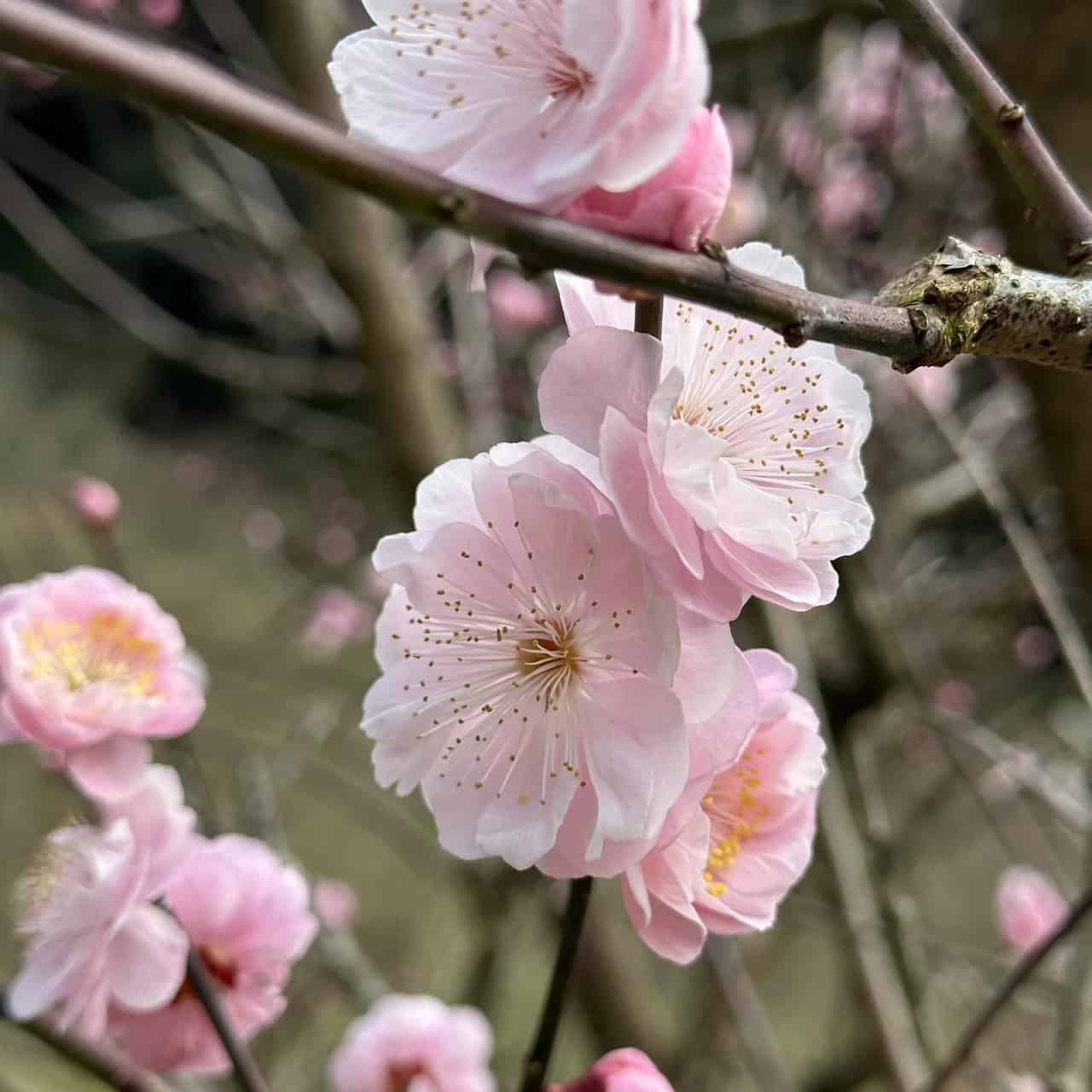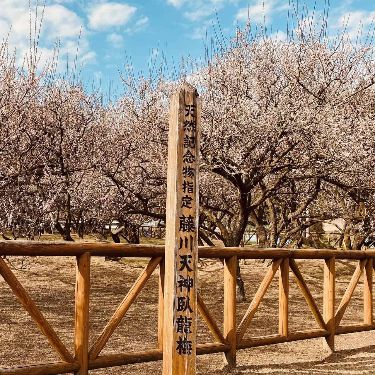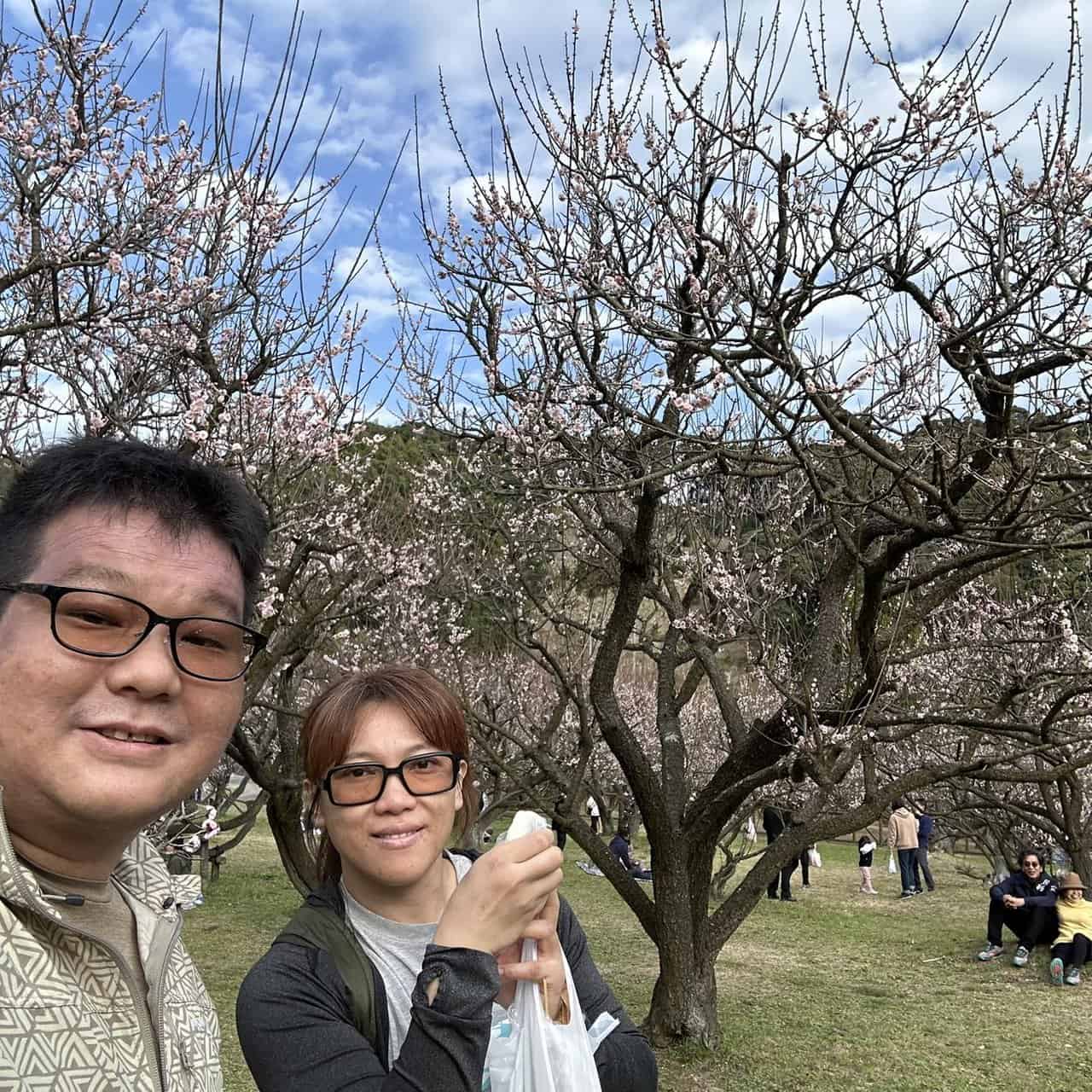 這讓我們想到,鹿兒島 藤川天神的 臥龍梅林,那神社內的濃郁梅香,讓已經在日本賞梅多次的我們,震撼到難以忘懷,畢竟占地大或種類多的梅林不少,但這樣的梅香我們只遇過那次,我想跟地形也有點關係,除了種植超密、大量盛開之外,谷地的特性和風的配合,應該都是成因吧