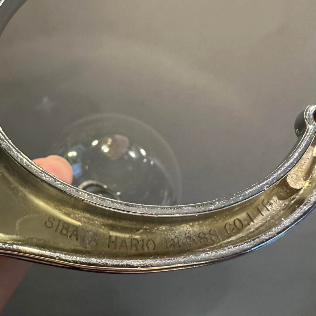 一般我們常見的HARIO TCA-3是L型直角的,下座完整電鍍寫的是HARIO,但可看到我還有一隻他的提把和底座的形狀和花紋都有濃濃的復古感,他寫的是SIBATA HARIO,底部有點歲月的痕跡