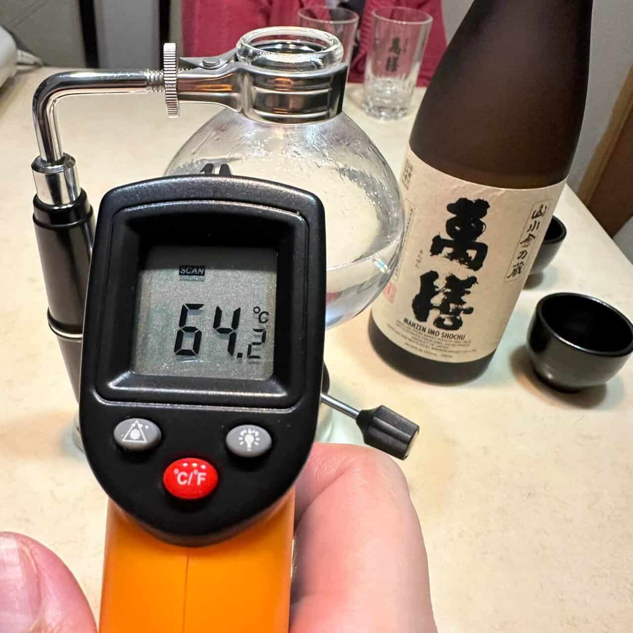 假設25度燒酎6:4水下去煮, 看到壺中有明顯透明的條紋在移動,大約就是50度左右,速度會越來越快,最多到有出現極小氣泡就要停了,再煮下去會超過75度