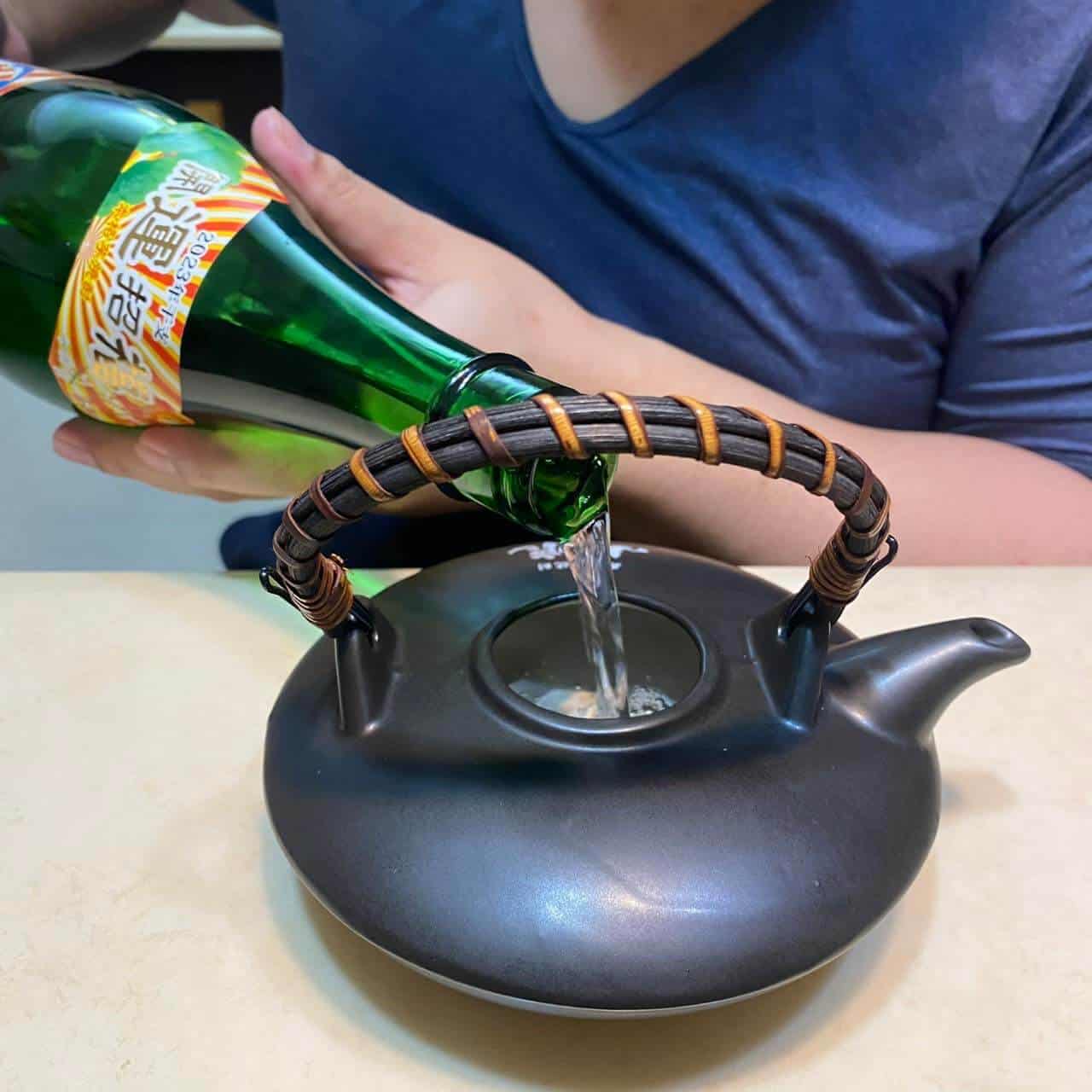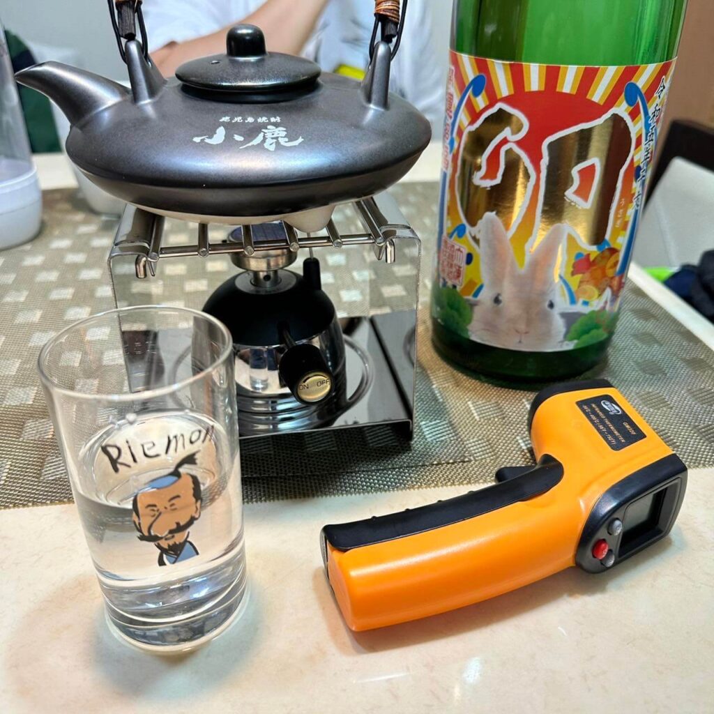 一旦聽到嘶嘶聲並感受到熱氣,即轉小火,用紅外線溫度探測儀,確認溫度約在70~73度時,就能關火,並從壺裡倒出香味已經瀰漫的燒酎🔥