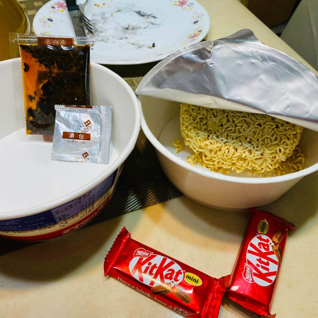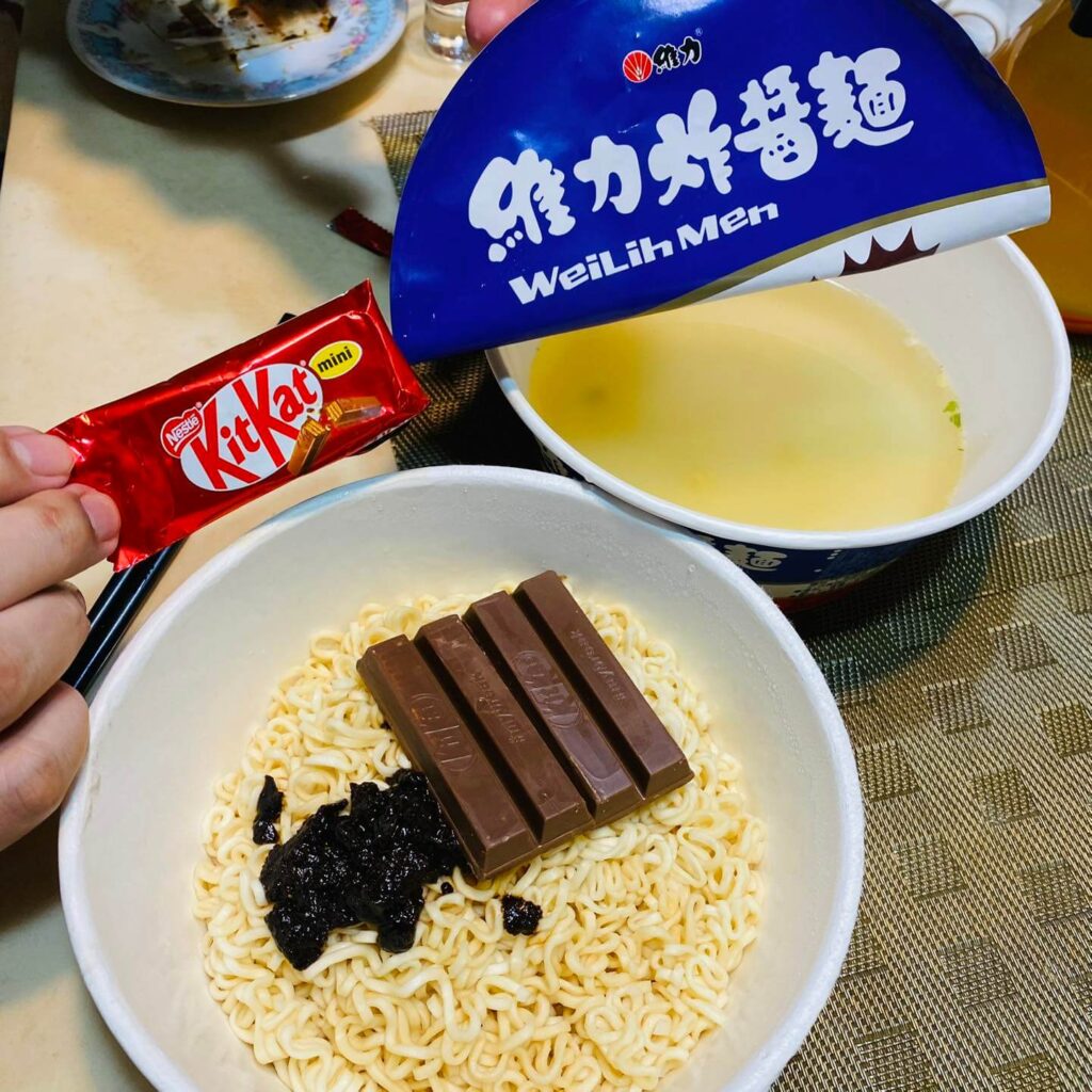 之前看到 炸醬麵 加 士力架 會很好吃的新聞被燒到,剛好冷凍庫中有超甜吃不完的德國版KitKat,一試覺得還真不錯吃耶