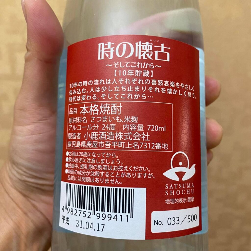 「10年儲藏 時の懐古~そしてこれから~ 小鹿酒造」在「平成」最後的兩個禮拜裝瓶,設定為24%酒精,到現在總共是15.5年的小鹿燒酎,純喝起來,不是想像的陳年甕味 或 毫無生氣的老燒酎,而是還保留些新鮮氣息的白麴黃金千貫芋燒酎,地瓜味很明顯,喝起來還有種濃縮鳳梨汁或番茄汁的香味,時間讓酒精變得圓滑,卻沒有變得無趣,是隻有水準的燒酎,而且煮過更好喝