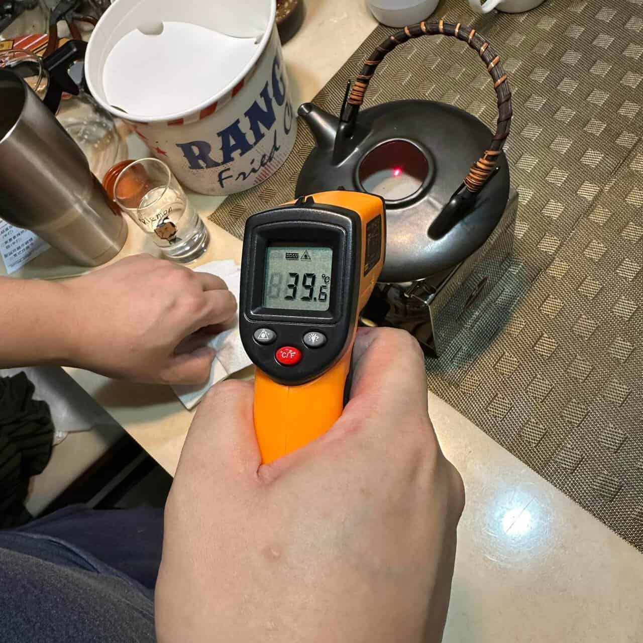 因為黑千代香完全不透明,也沒地方放溫度計,無法觀察到內部狀況,所以我用「紅外線測溫槍」來評估,開始我還打開來測溫度,後來想想其實量 黑千代香外面也差不多,大概就好又不是要做化學實驗或甜點