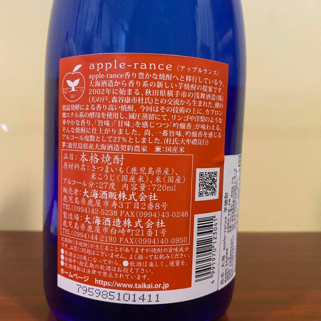 Apple Rance 的酒精濃度雖然高達 27%,但酒精感隱藏得很好,喝得出微微的蘋果香氣,有甜度但還算正常範圍,而減壓白麴芋燒酎的特性也很明顯,並沒有因為是果香型燒酎,就走水果水的路線 不過純喝來講有稍微重一點,確實照酒造建議的,加點水會更能享受他的風味