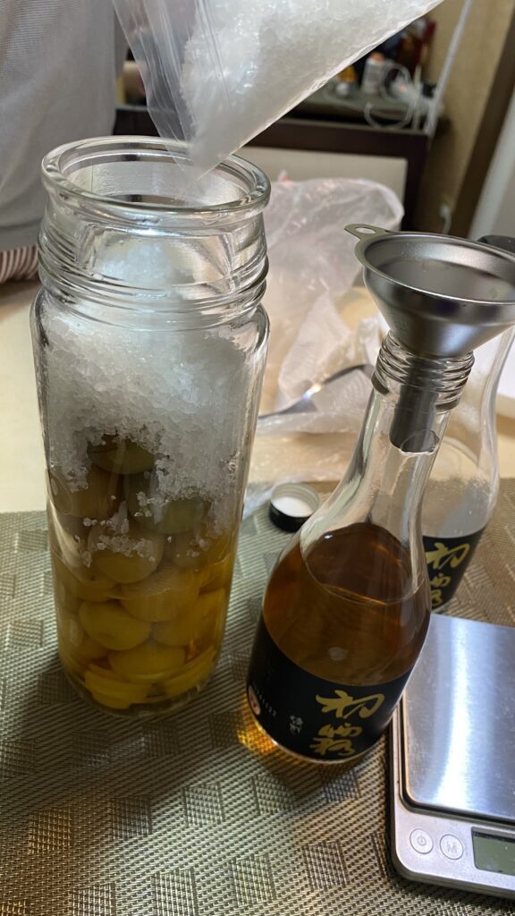 312克的糖加進了2/3到瓶裡,接著再倒回燒酎,看到雪白的冰糖漸漸沉入底部,怕它積在底部不融,upside down動一下,瓶子好像沙漏,糖在梅子的空隙中流動