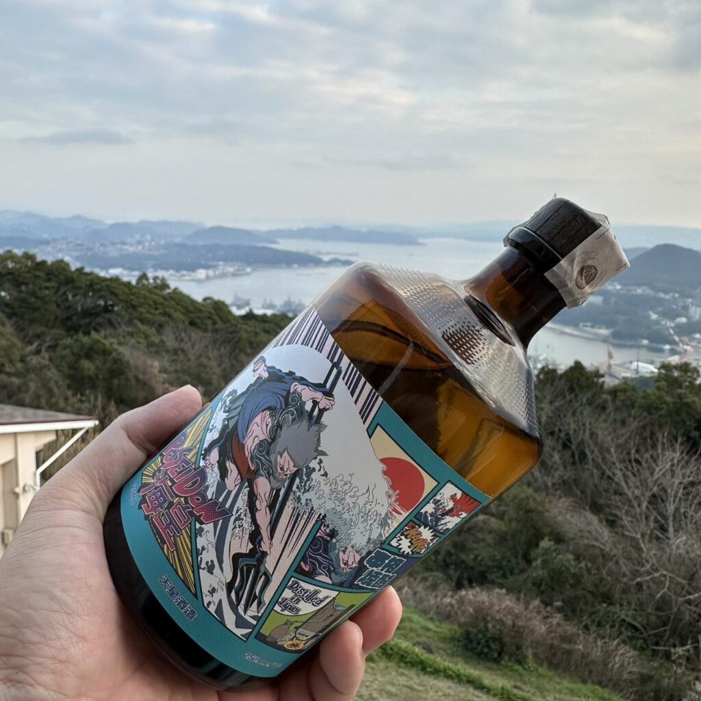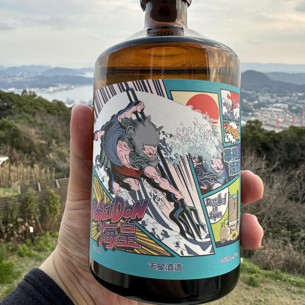 「波賽冬燒酎」是日本燒酎酒吧Glocal BAR Vibes 與 天星酒造合作的商品,酒瓶上的酒標很亮眼又特別,是富有故事性的漫畫分鏡,從一個隱隱約約的身影,以旭日為背景,滾滾浪濤拍打出KAIKO之名,傳說中的波賽冬乘著像神奈川沖的巨浪現身,銳利的視線指向三叉戟的目標,他是在揮動武器攻擊嗎?不,下方蒸餾著酒醪,波賽冬以三叉戟擊地,讓清泉破石而出,誓讓生命力澆灌出美味![]()