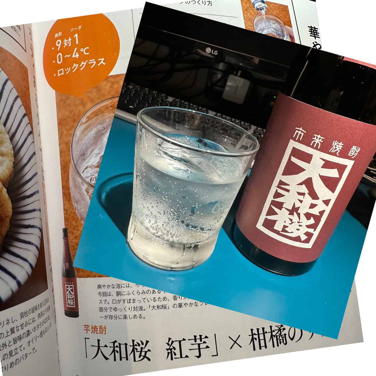 「大和櫻 紅芋 9:1 氣泡水」天氣越來越熱,是該來杯冰燒酎的時候了,在燒酎雜誌中剛好翻到大和櫻 紅芋,材料有齊就來試看看吧