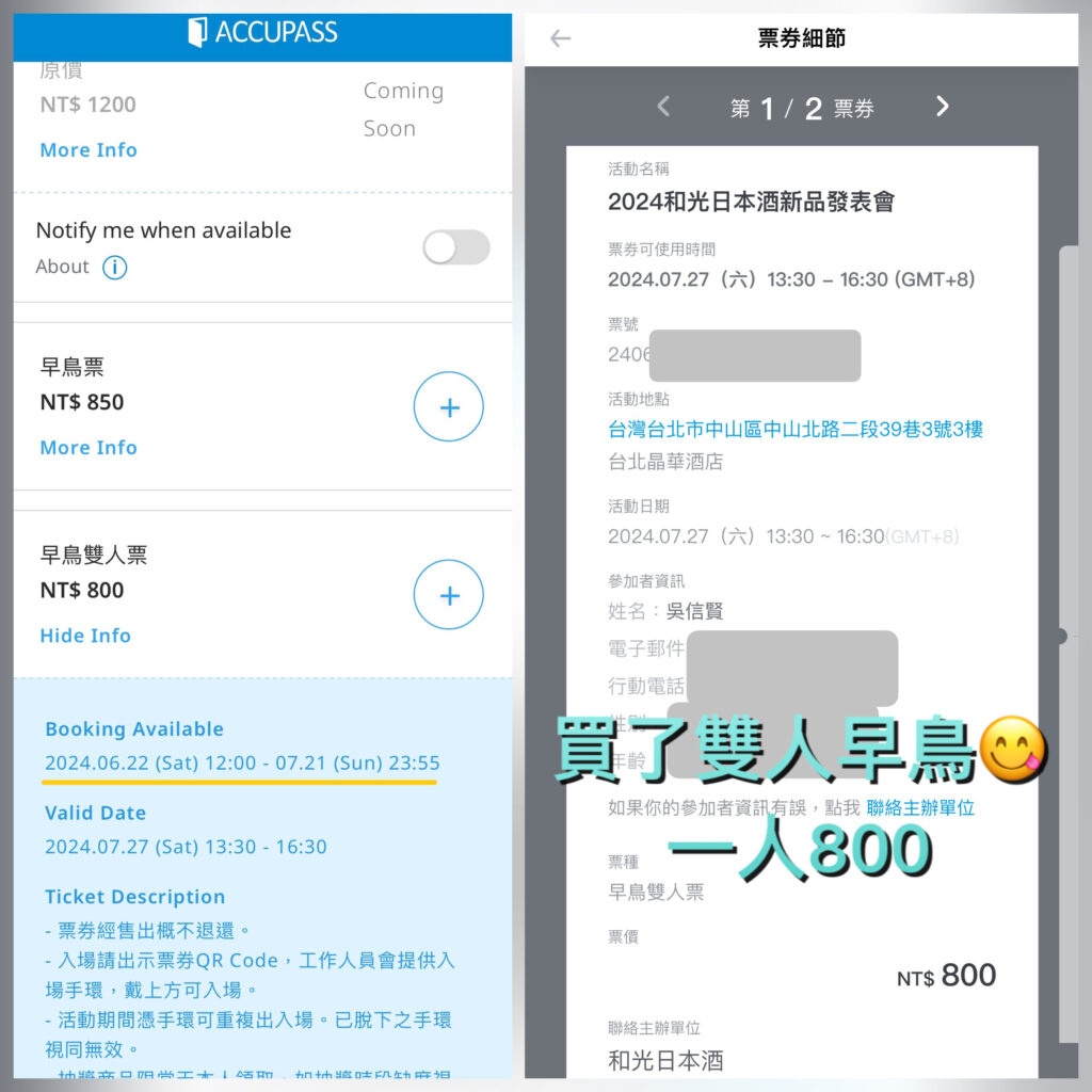 這次買票在活動通上,早鳥850 賣到7/21的23:55,雙人早鳥 800/人 就是1,600拉,拉朋友一起去可以各省50